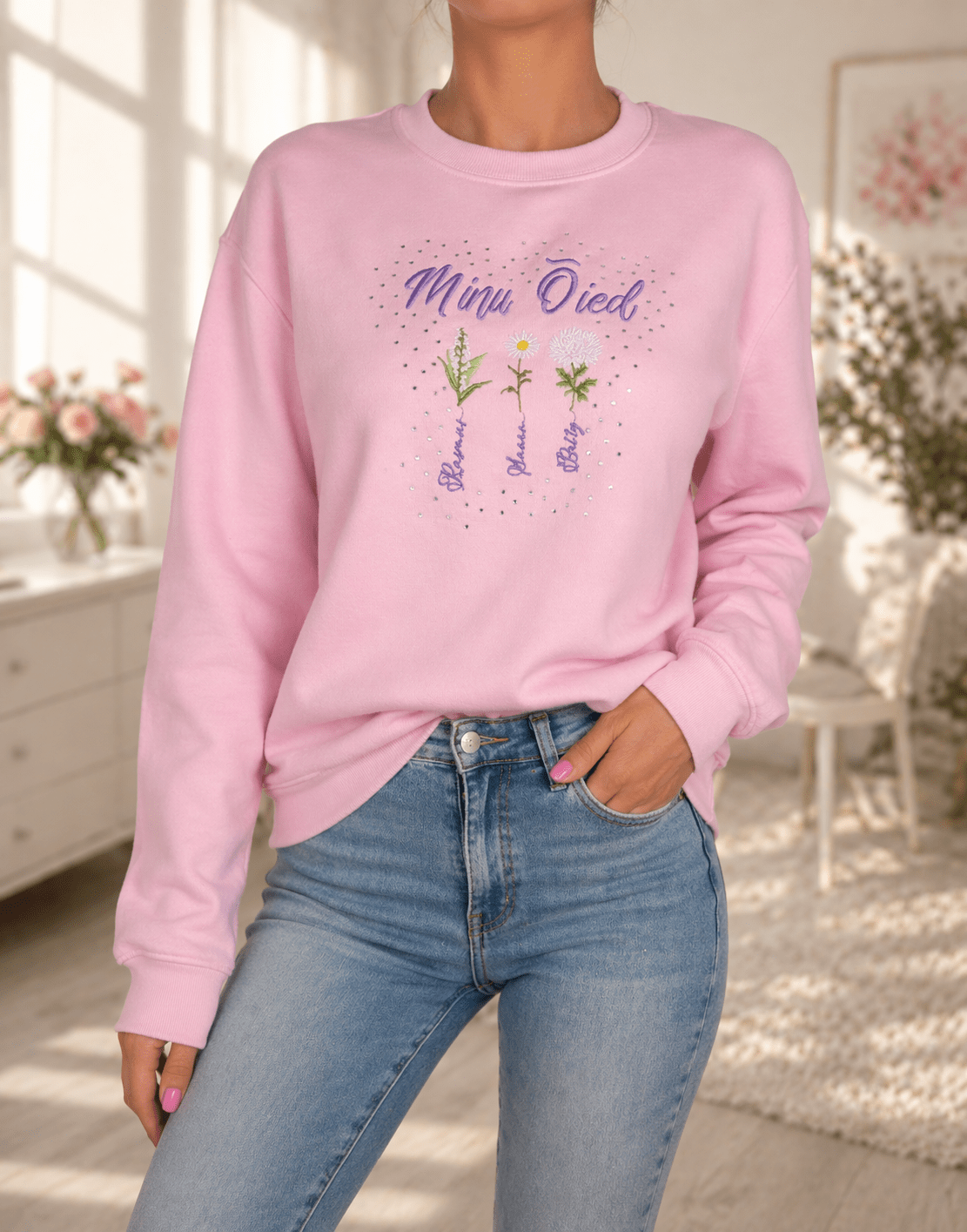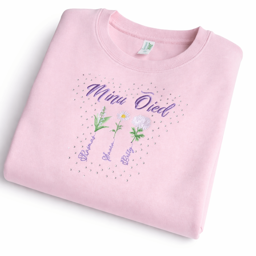Pehme ja naiselik pusa, mis kannab endas kõige kallimat tähendust. “Minu Õied” tikandiga pusa on eriline personaalne ese, kuhu saad lisada laste nimed ning luua ainulaadse mälestuse, mida kanda iga päev südame lähedal. Õrn lillemotiiv, kaunis tikand ja säravad kristallid loovad kokku elegantse ning pilkupüüdva terviku.
